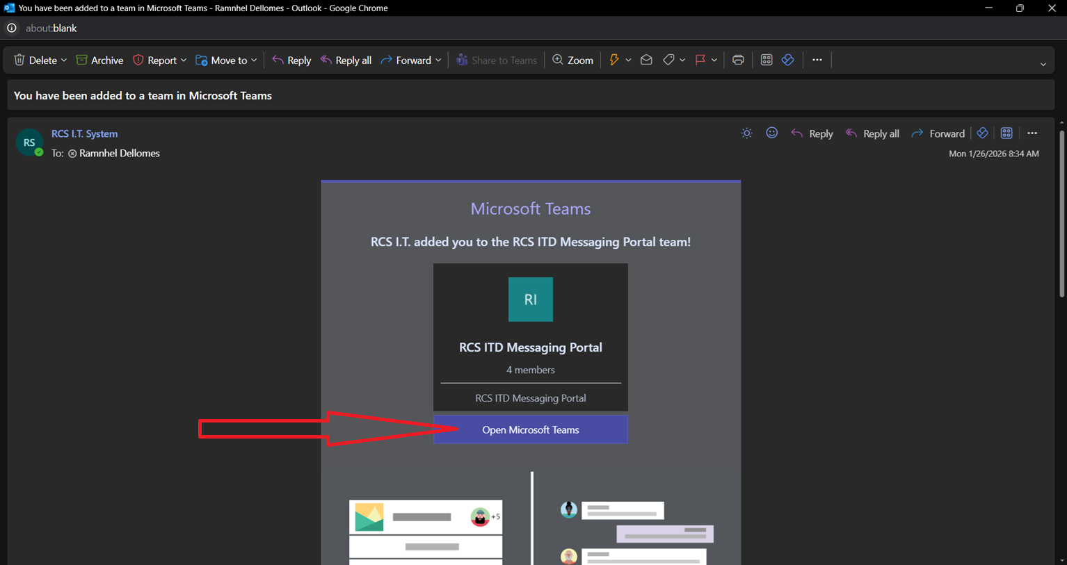Step 1. If you received an email indicating that you are invited to a specific “Teams/Channel”, click on “Open Microsoft Teams”.