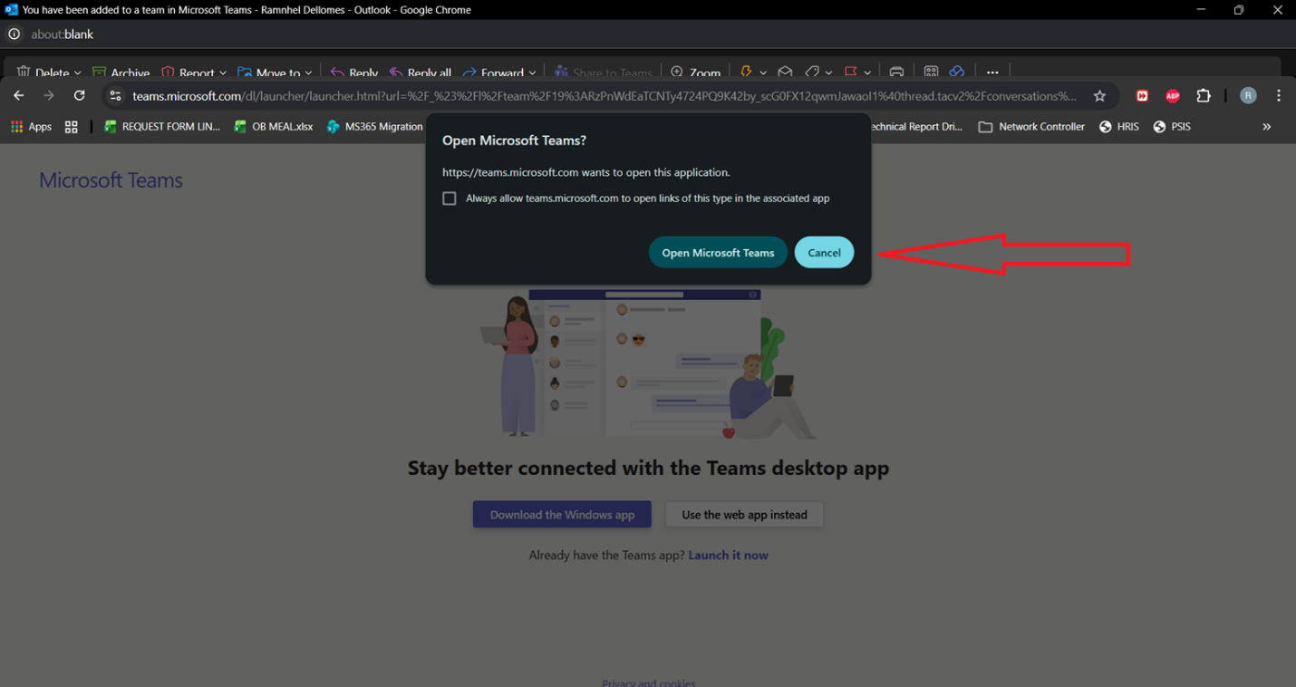 Note: You will be redirected on MS Teams “Web Portal” and you can now view the “Teams/Channel” that you were invited from. (Please see screen shot below for reference.)